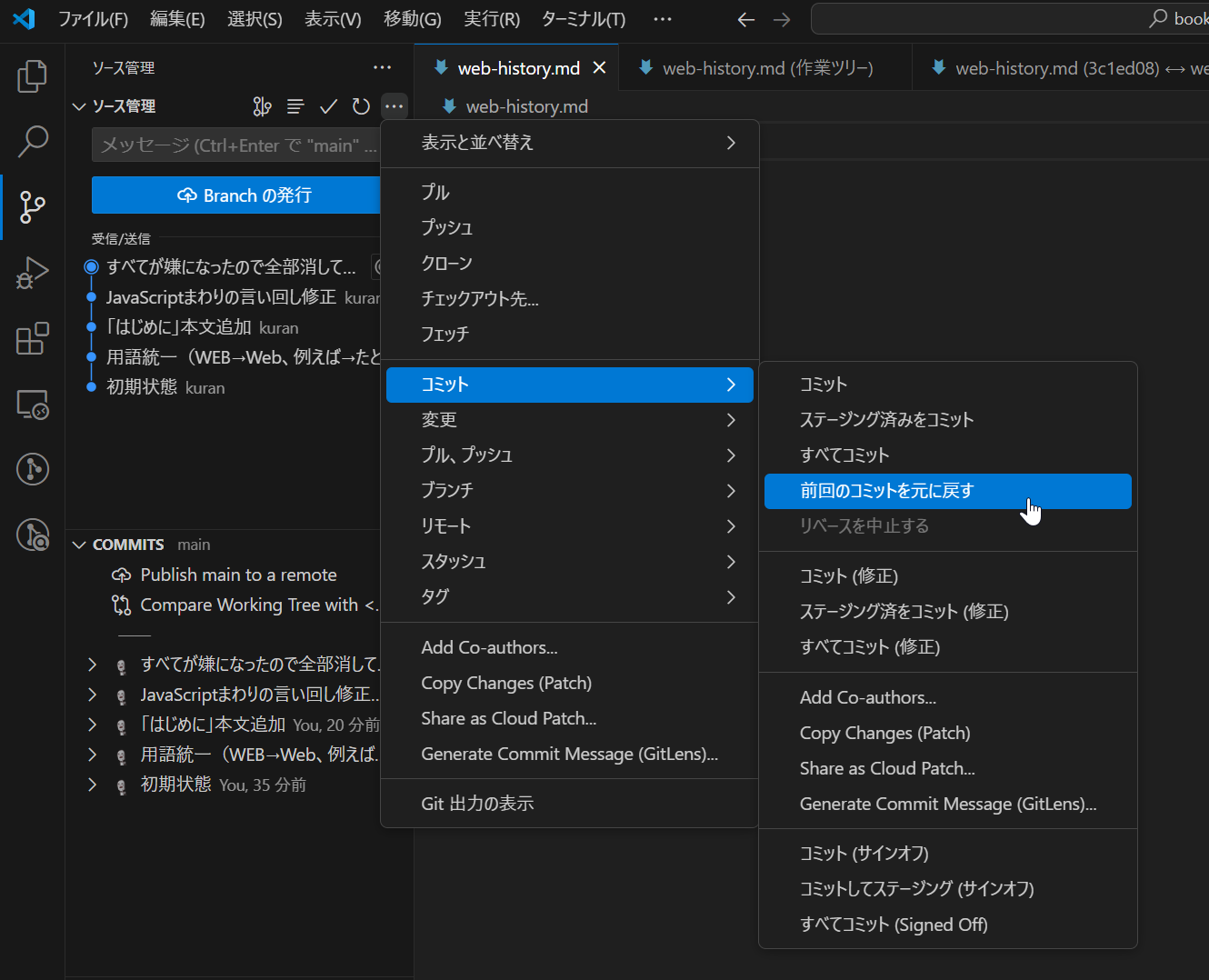 - ソース管理ビューの右上のメニューアイコン「…」をクリックし、「コミット」→「前回のコミットを元に戻す」をクリックします。コミットの直前に時が戻ります。